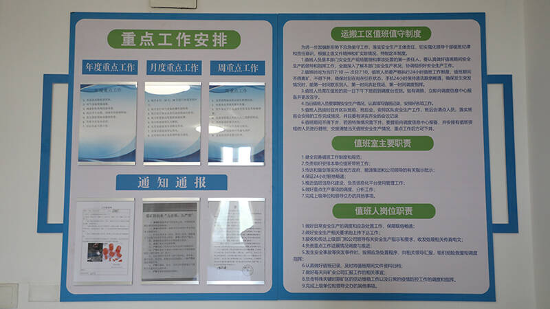 同时,在值班室还增设了年度、月度重点工作推进展板和通知通报栏,让值班人员更好地查看图纸,了解重点工作和现场工作实际情况,方便工作任务交接。