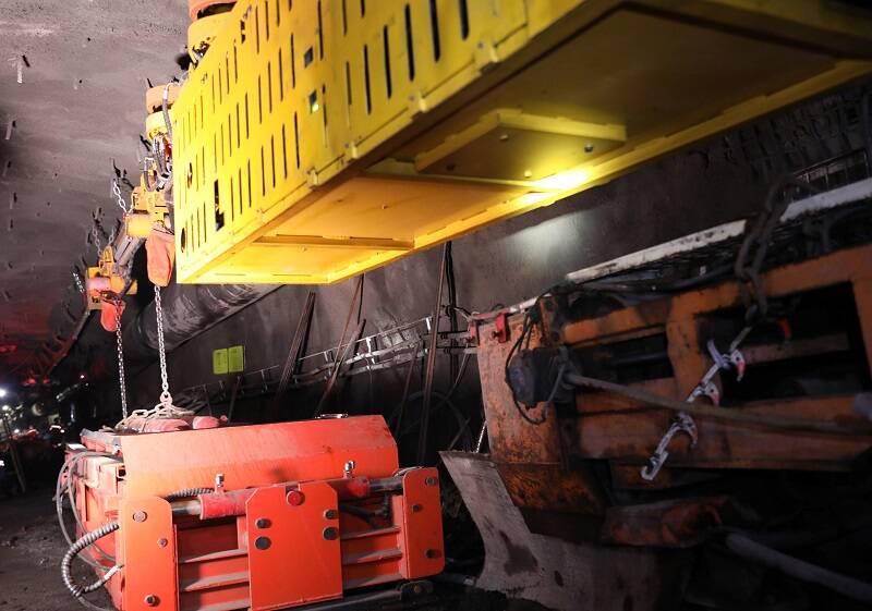 “梁家煤矿是典型的‘三软’地质条件,需要通过快速喷浆封闭,提高岩煤体的自身强度,而喷浆会将钢带、锚索盘全部覆盖,从而给单轨吊吊点施打位置带来很大的影响。”综掘工区区长王世长介绍,为保证单轨吊轨道安装和施工质量,该矿积极克服因喷浆带来的施打“盲区”,实施“调整底座+缩环”的方式,对单轨吊吊链长度进行微调。同时,结合“三软”煤层顶板易下沉,巷帮的易变形的实际,加大使用过程中的关注力度,一旦发现吊轨不符合要求的,通过实施“锚杆+吊链”加固补强的实施方案,全面提高单轨吊质量标准化水平,确保运输安全。