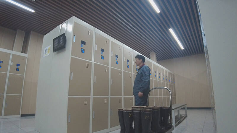 为进一步增强职工的幸福感和获得感,该矿升级智能化橱柜,每个橱柜均配备更换新风、臭氧消杀、无钥匙进入、信息显示、温湿度监测等功能,并可以自动排风、消毒、杀菌,湿毛巾可实现8小时干燥,胶靴可实现异味杀菌等,职工幸福指数显著提高。