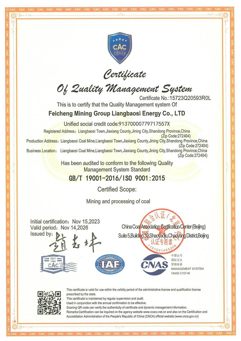 日前,梁宝寺煤矿顺利通过2023年ISO9001质量管理体系认证,中煤协联合认证(北京)中心ISO9001质量管理体系认证审核专家组为梁宝寺煤矿颁发了带有CNAS认可标识的质量管理体系认证证书。ISO9001质量管理体系以“质量”为本、“品质”为根,是目前世界公认的、含金量较高的质量认证证书,是一个有使命感的企业不懈追求的权威认证,也是企业持续、稳定、健康发展的有力保障。