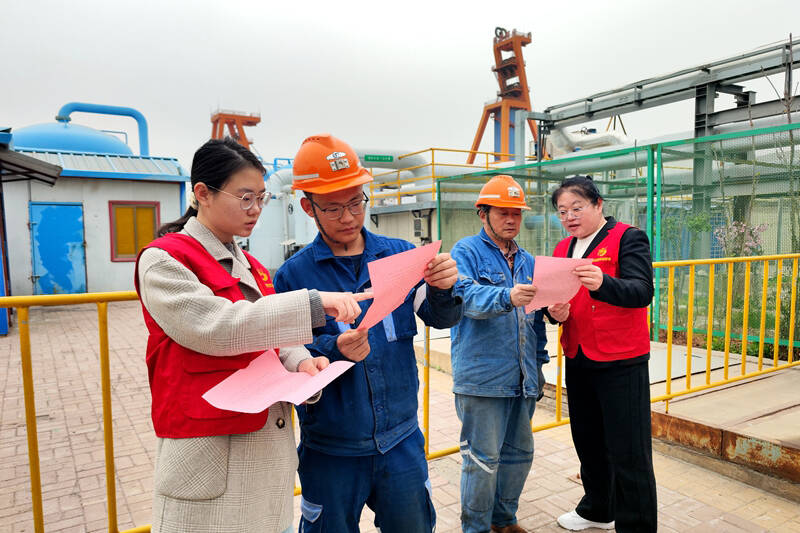 近日,在李楼煤业污水处理站,女工协管员侯怡丹与刘凤云为现场职工发放《安全规程要点解读》宣传单,叮嘱他们时刻将安全规程牢记心间,上标准岗,干放心活。