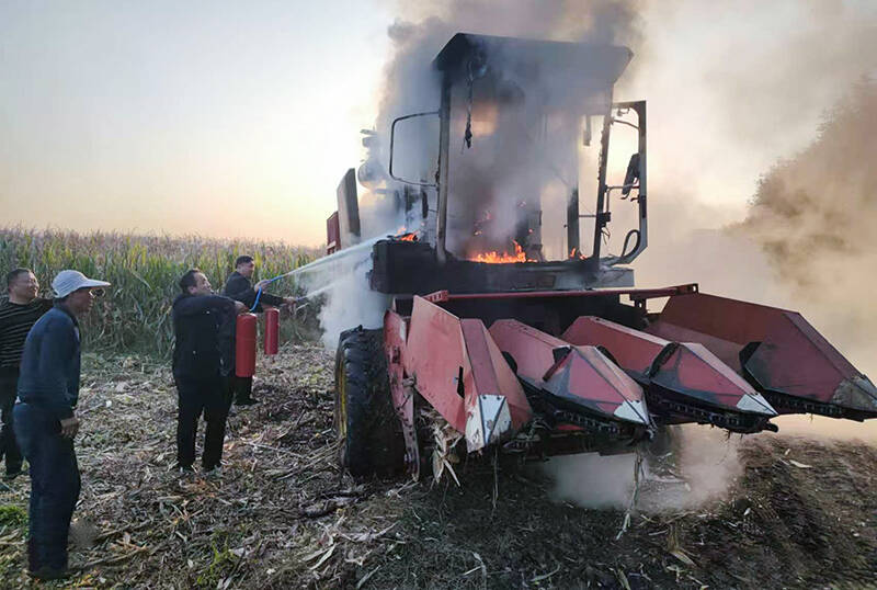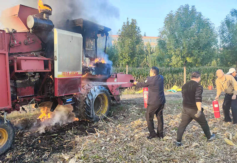 接到求助的值班人员当即上报,立即组织安保人员携灭火器火速驰援。抵达现场时,收割机已被熊熊烈火包裹,滚滚浓烟呛得人无法靠近,周边堆积的秸秆和成熟玉米若被引燃,后果不堪设想。更棘手的是,田间小路狭窄,洒水救援车无法进入。