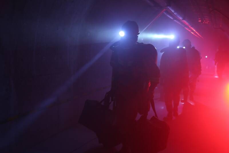8时25分,三支队伍准时抵达模拟事故现场。指挥员迅速完成战前检查,随即奔赴地面指挥部领取任务。在统一指令下,队员们背负装备,依次下井,身影迅速消失在演习巷道入口。