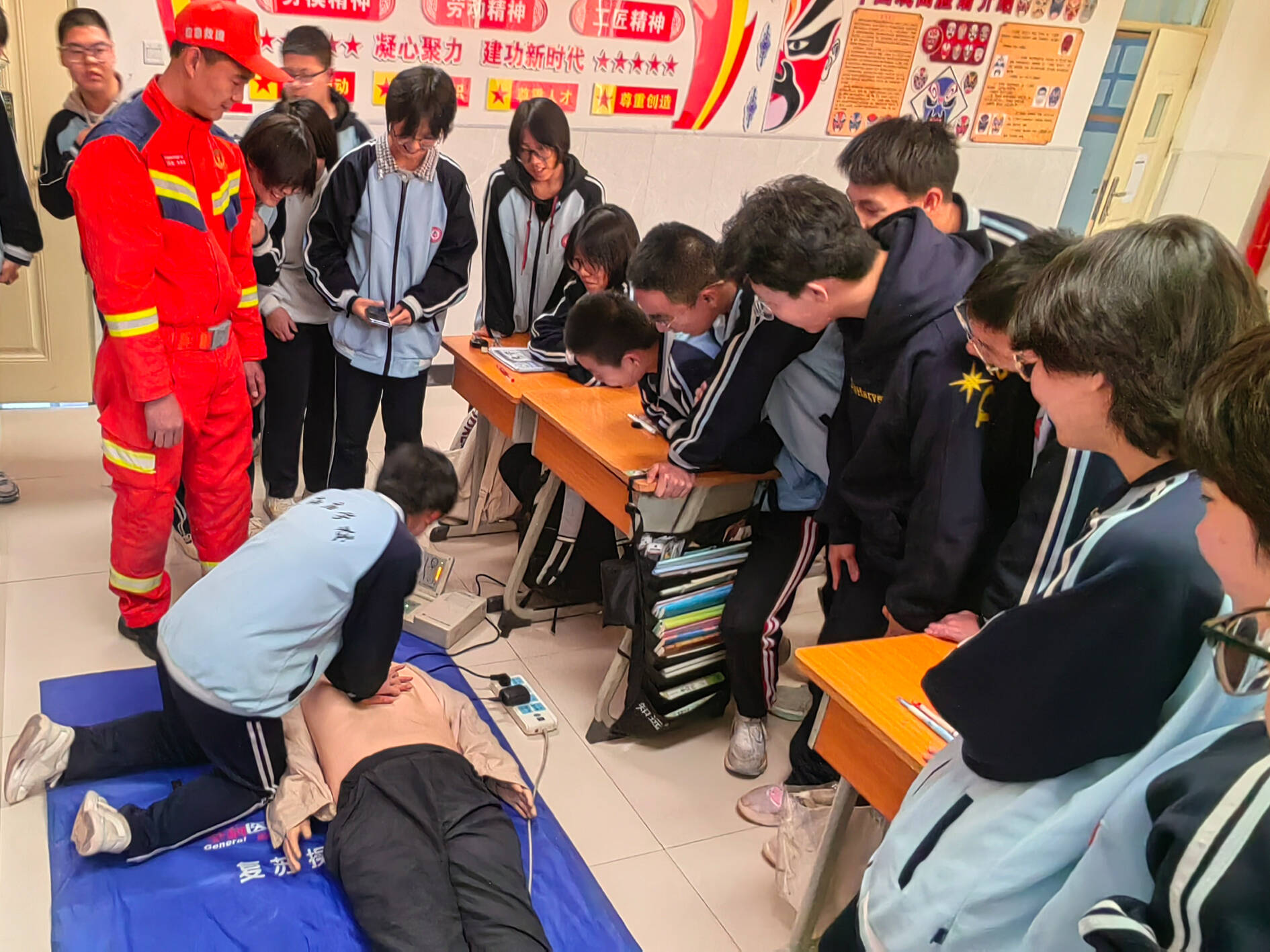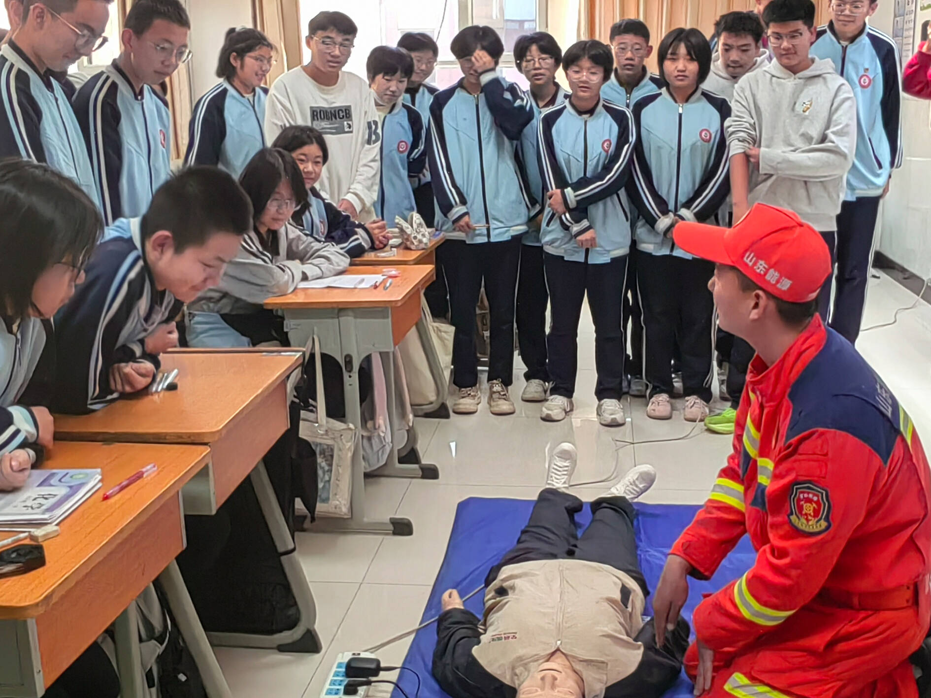 培训围绕心肺复苏和海姆立克急救法两项关键技能展开。救援人员结合学生认知特点,采用“讲解+案例+实操+情景模拟”的方式,把专业急救知识与校园常见意外联系起来,用通俗的语言讲解操作步骤,通过趣味演示让急救知识不再枯燥。