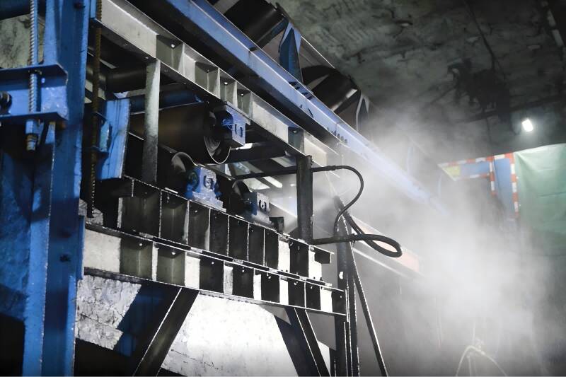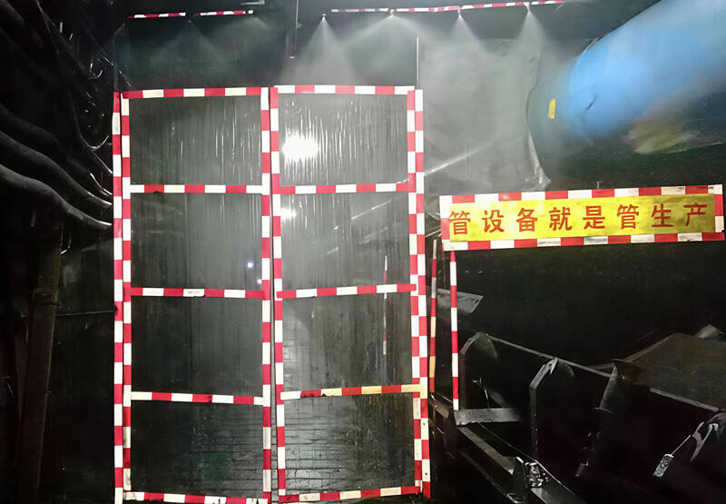 清理产生的煤泥水,经“水冲—挤压式”清扫器底部漏斗装置引入附近水沟,流入沉淀池后通过渣浆泵打入压滤机处理。压滤后的煤泥重新回收进入运输系统,清水则沿水沟流入就近水仓,实现资源循环利用。同时,机道内每隔200米安装一组全断面升降式自动喷雾装置,不仅使覆盖区域粉尘浓度下降70%-80%,还能让环境温度平均降低3-5℃,达成“降尘降温”双重效果,真正实现“运输不带尘,巷道不积尘”。