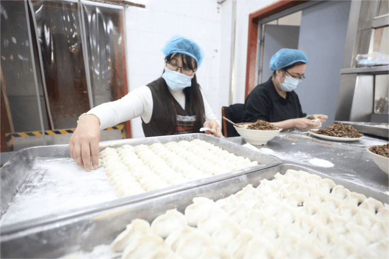 案板声声作响,饺香袅袅升腾。女工协管们围坐在一起包饺子,动作娴熟利落,雪白的面皮在她们手中翻飞,一个个饱满圆润的水饺很快摆满了托盘,既有象征团圆的圆形饺,也有寓意吉祥的元宝饺。